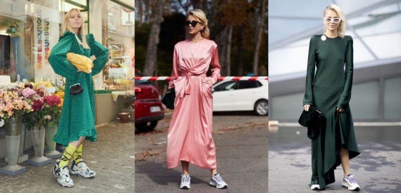 我很喜歡反差感強的裝扮,如果搭配亮片絲綢這種華麗感強一點的長洋裝或長裙,再搭上一雙中性的老爹鞋,休閒與正式的混搭會非常有型!