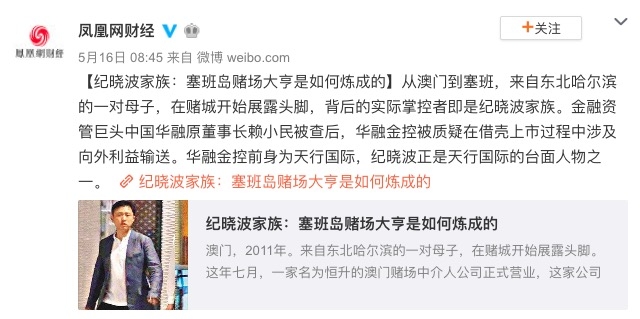 從澳門到塞班,來自東北哈爾濱的一對母子,在賭城開始展露頭腳,背後的實際掌控者即是紀曉波家族。金融資管巨頭中國華融原董事長賴小民被查後,華融金控被質疑在借殼上市過程中涉及向外利益輸送。華融金控前身為天行國際,紀曉波正是天行國際的檯面人物之一。...點此前往