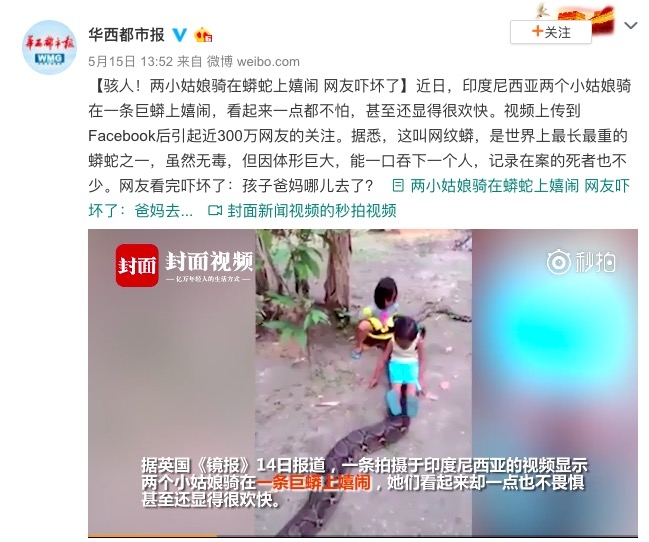 微博詳情: 近日,印尼兩個小姑娘騎在一條巨蟒上嬉鬧,看起來一點都不怕,甚至還顯得很歡快。視頻上傳到Facebook後引起近300萬網友的關注。據悉,這叫網紋蟒,是世界上最長最重的蟒蛇之一,雖然無毒,但因體形巨大,能一口吞下一個人,記錄在案的死者也不少。網友看完嚇壞了:孩子爸媽哪兒去了?點此前往