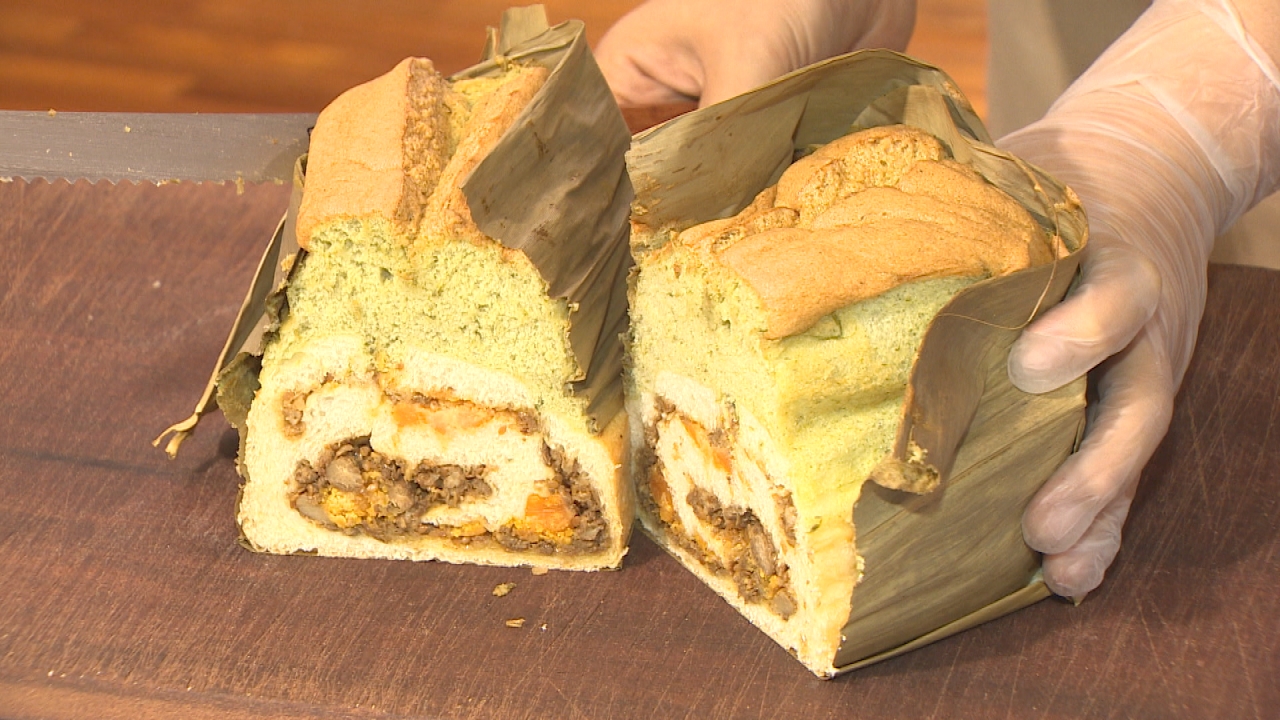 粽葉裹吐司,葫蘆裡賣的是?刀子一切見真章,內餡全都露,裡頭竟然有豬肉、鹹蛋黃,一口咬下,鹹香滋味迸出,上頭綠色蛋糕體,散發著淡淡艾草香,絕妙口感,吃法也奇特,還能沾甜辣醬,說怪不怪,吐司有著濃濃肉粽香。