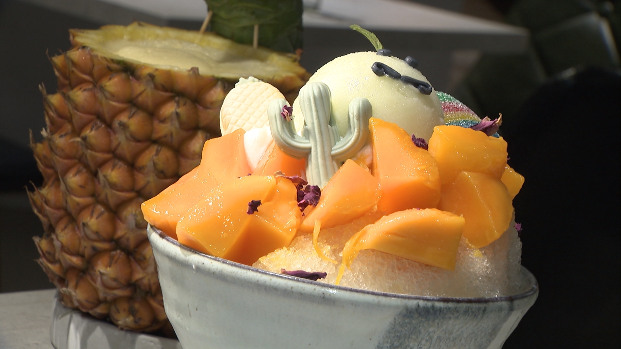 果肉也大有用處,送進果汁機,不加糖、不加水,直接打成鳳梨果汁,一隻鸚鵡吃得到果肉、果汁和冰淇淋三種口感。還有日式剉冰,當季的芒果冰大變身,多了俏皮表情,還能吃得到翻糖、卡士達醬,冰品結合甜點。