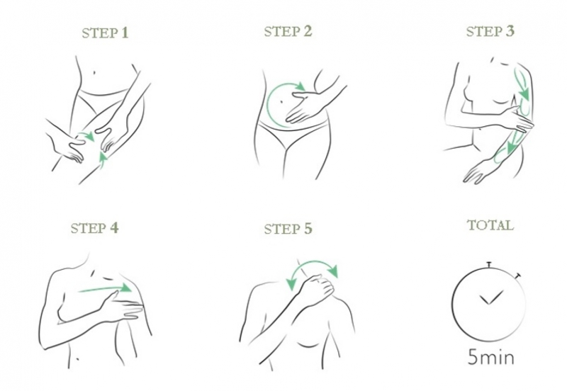 HOW TO 首先取適量美膚霜或美膚油塗抹於大腿,以捏壓手勢緩慢深入的力道按摩,加強腿部循環,舒緩緊繃肌肉;接著以肚臍為中心點順時針方向輕揉地按摩,促進腹腔循環;再採取8字型掌心由上而下螺旋按摩手臂,強化手臂線條;步驟四用掌心從胸口往鎖骨方向推滑出去,有助於消除浮腫,並改善脖子線條;最後以四指由頸後方輕柔地往前推滑按摩肩頸部位,壓力將隨之逐步釋放,達到深層放鬆及減壓。