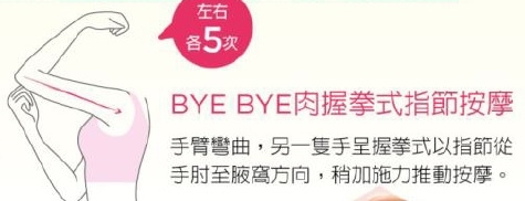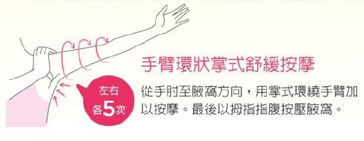 從手肘到腋窩,用手掌環繞式按摩,最後停在腋窩,以大拇指的指腹按壓到微痠,促進淋巴循環