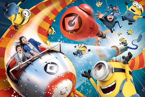 一進到日本環球影城即可感受到小小兵的超高人氣,而位於其專屬園區的「小小兵瘋狂乘車遊」更是鐵粉們不容錯過的遊樂設施之一,從一開始看了超可愛的動畫片後,再各自進入包廂內搭上格魯發明的飛車緩緩上升,進入怪盜格魯的宅邸兼研究室後,可以看到小小兵們以巨大的半球型螢幕放映出來,充滿臨場感的畫面讓人感覺已進入畫面裡與小小兵們共同四處奔馳冒險。