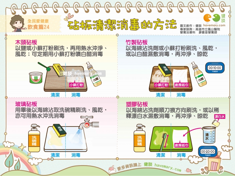 砧板是廚房烹調必備用具,但每日使用砧板切剁各式肉品、海鮮、蔬菜、水果,該如何才能確保砧板清潔呢?高雄市立鳳山醫院營養治療科廖嘉音營養師表示,不同的砧板適用不同的清潔與消毒方法,每日徹底清潔,並依個人使用頻率定期消毒,就更能保障居家飲食健康喔!