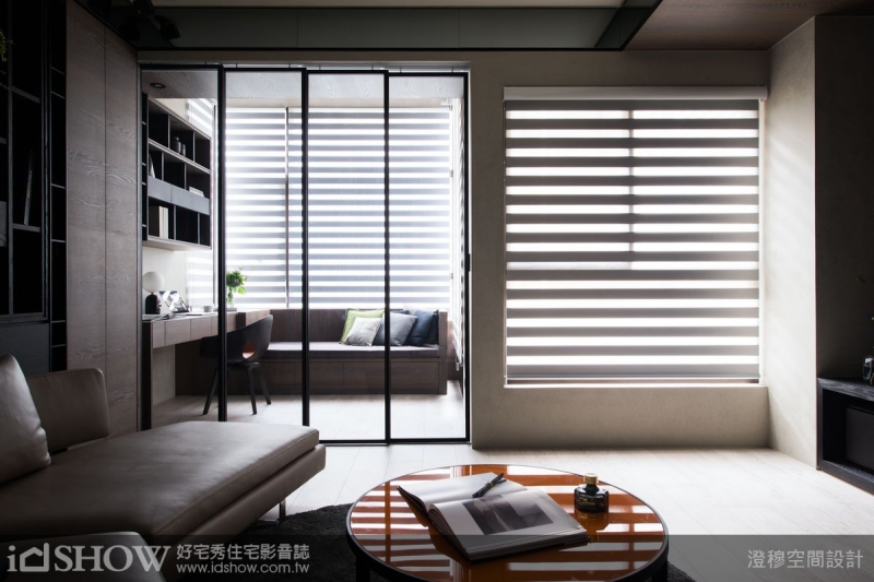 TIPS:位於客廳旁的書房,設計採用玻璃拉門,搭配半透光的橫條紋捲簾,讓光線在其中一點一絲的徘徊流連,創造出輕盈透明的清爽質感。