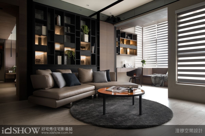 TIPS:客廳沙發後方的半開放式黑色實木展示架,與書房相呼應,內裡飾以仿大理石紋美耐板,在嵌燈暖黃微光襯托下,形塑柔和優雅的浪漫氣息。