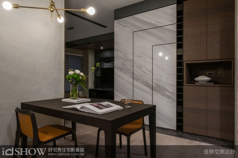 開放式餐廳處於住家中心位置,線條簡單的餐桌與黑黃相間餐椅的組合,搭配天花的造型燈具,不僅反映屋主堅持自我的個性,也展露明快俐落的都會節奏。主臥室延續深色基底以木紋搭配沛納海電視牆,地板斜拼延伸至牆上,除了拉長視線之外,也讓整體空間更為延展、寬闊,且臥室延續客廳設計元素,白色天花點綴黑色燈溝,透過色彩的鮮明對比串連出整體一致的時尚調性。至於主臥衛浴採用白色石紋磁磚及大理石檯面,輔以乾濕分離的設計及大型浴缸,打造五星級番店般的尊榮洗浴體驗。