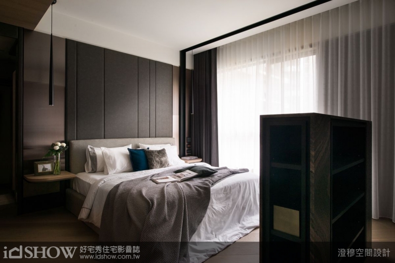 TIPS:主臥室延續客廳設計元素,以白色天花點綴黑色燈溝,透過色彩的鮮明對比串連出整體一致的時尚調性。