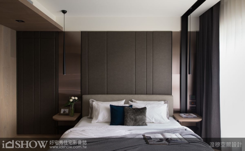 TIPS:主臥室延續深色基底以木紋搭配沛納海電視牆,讓整體空間更為延展、寬闊。