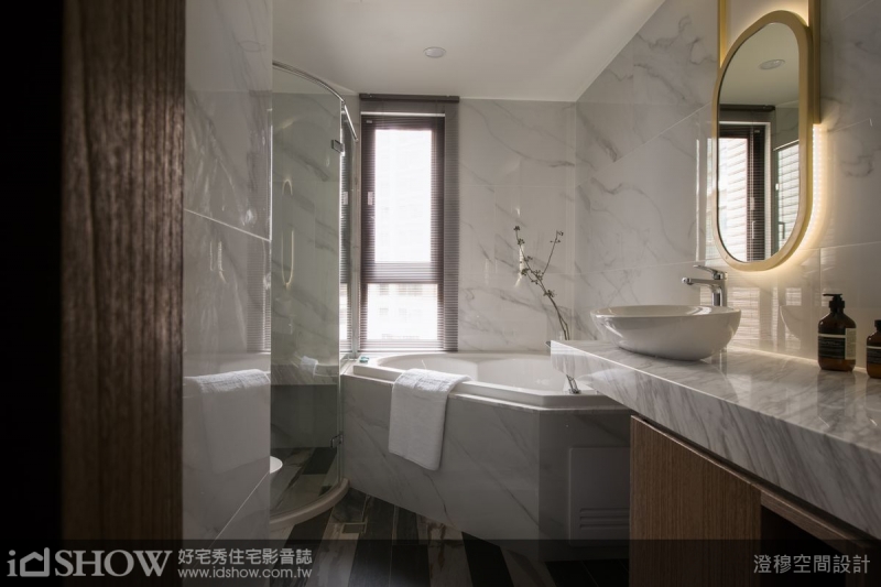 TIPS:主臥衛浴採用白色石紋磁磚及大理石檯面,輔以乾濕分離的設計及大型浴缸,打造五星級番店般的尊榮洗浴體驗。