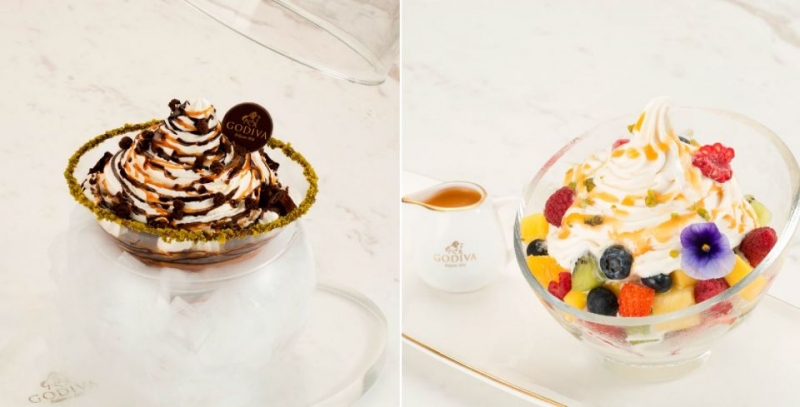 Godiva忠孝生活形象店在5月7日起推出「GODIVA巧克力聖代」(NT$330)與「鮮果巧克力聖代」(NT$300),皆以經典的霜淇淋為基底,前者灑上濃郁巧克力蛋糕塊,再淋上巧克力醬和水果泥,最後配上滑順鮮奶油與香脆巧克力脆球,還有杯緣的翠綠色開心果仁脆;後者則搭配各種新鮮水果,再淋上水果泥,享受夏季的清爽冰品。