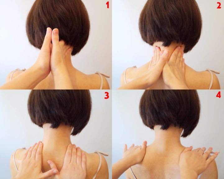 Step1哈囉,按摩開始:雙手上產品後,稍微搓揉加熱,雙手的四指指腹以安撫滑動的方式,稍微下壓施力,由頸部滑至雙肩,再由雙肩滑回頸部,來回約3~5次。