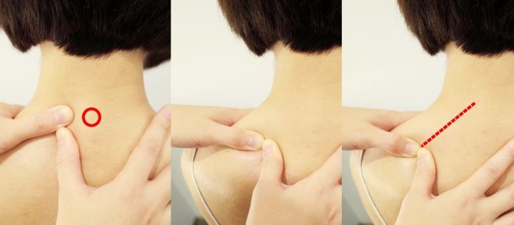 Step2放鬆小菱形肌:找到大椎骨後,從旁邊為起點,雙手拇指指腹「以下壓後,稍微往後推」的力道,推到肩胛骨旁的骨縫(不要碰到骨頭),依痠痛狀態,可重複多次。