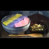 大刀一切,剛做好的粉粿,染上蝶豆花的艷麗色彩,ㄉㄨㄞㄉㄨㄞ口感,在盤子上跳舞,黃色的則是來自梔子花。