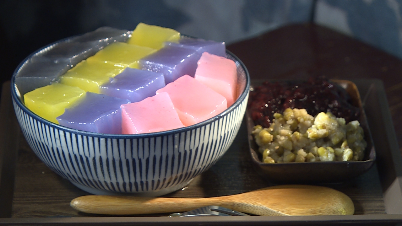 紅的、藍的、黑色粉粿,繽紛彷彿一道彩虹,藍色蝶豆花粉粿彈牙滑口,一入口好清涼,還能淋上桂圓蜜,炭焙桂圓的香氣湧上舌尖,底下黑糖清冰,還能混著綠豆、紫米一起吃。