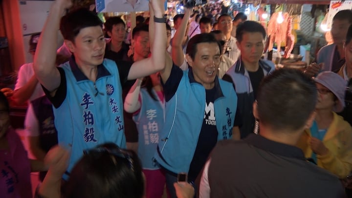 穿著輕便國民黨POLO衫,前總統馬英九現身成功市場,陪著市議員參選人李柏毅,沿著攤位掃街,婆婆媽媽好熱情,又是送果汁、送香蕉,還有人拿手機搶拍合照。