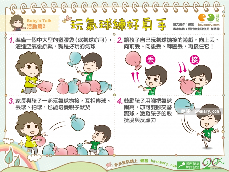 每個家長都會希望自己的孩子十項全能、動靜皆宜,雲門教室研發長謝明霏表示,其實孩子的反應與身手可以透過日常簡單的遊戲來幫助孩子訓練喔!藉由簡單的氣球遊戲,就可以讓孩子練習手眼協調、肢體活動,不僅可以鍛鍊本體覺,也有助讓孩子消耗體力,一舉數得!