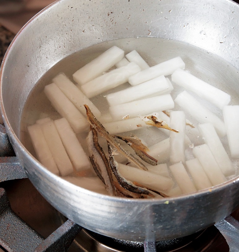 1. 用熱水汆燙油豆腐皮、去除多餘油分。400ml水、白蘿蔔及小魚乾入鍋。