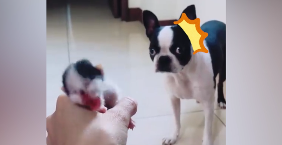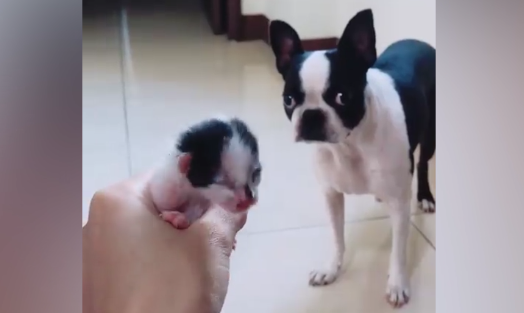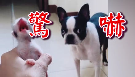 ▲汪星人初見小貓咪被哭聲嚇傻(source:影片截圖/波士頓筷筷vs麝香豬滿滿『筷滿出來的愛』)