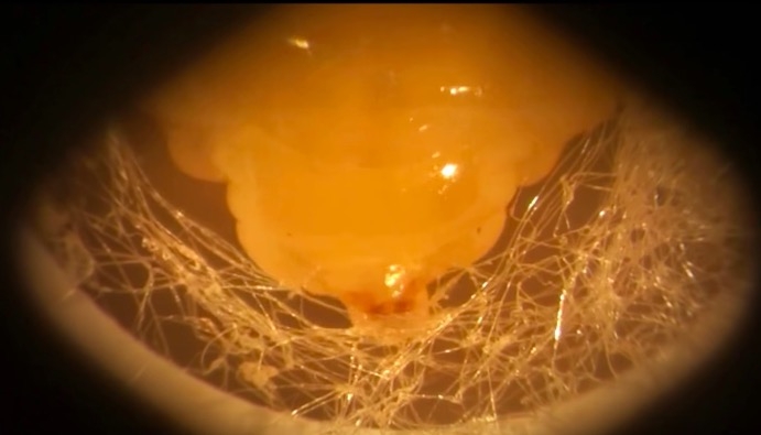 幼蟲在蟑螂體內節繭,吃著蟑螂的內臟▼