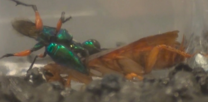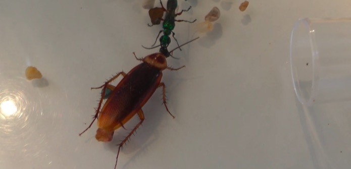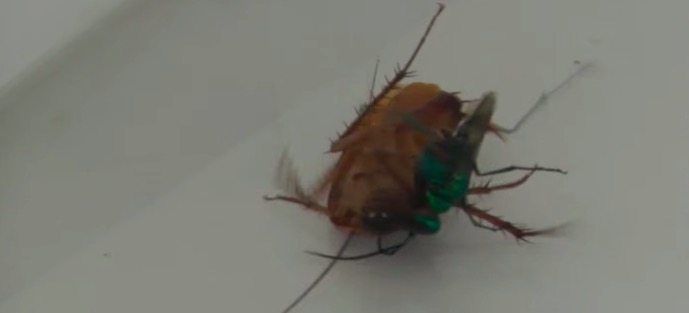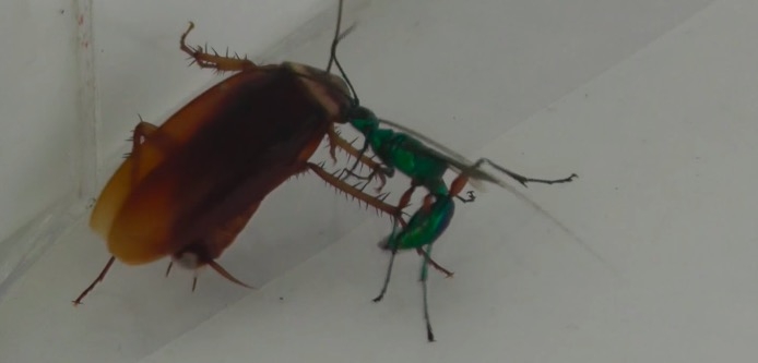 根據Entomological Society of America的報導,這種叫扁頭泥蜂的昆蟲會將蟑螂麻醉,讓蟑螂活著並把蟑螂做成不會自主行動的「殭屍」,然後在蟑螂腹部產卵,最後讓自己的後代從蟑螂體內「破蟑而出」!