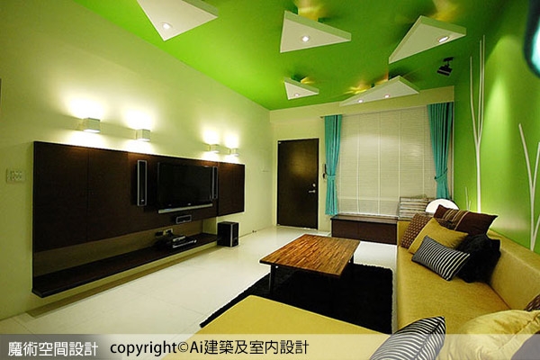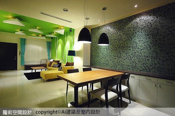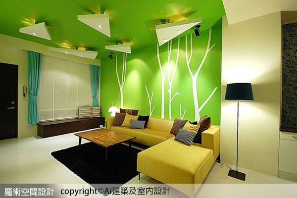 1.Ai建築及室內設計團隊以屋主喜愛的色彩引導空間氛圍,透過鮮明的綠色、白色樹枝、天花立體葉形等,交融具體與抽象的設計手法,描繪出宛如自然森林的客廳空間。