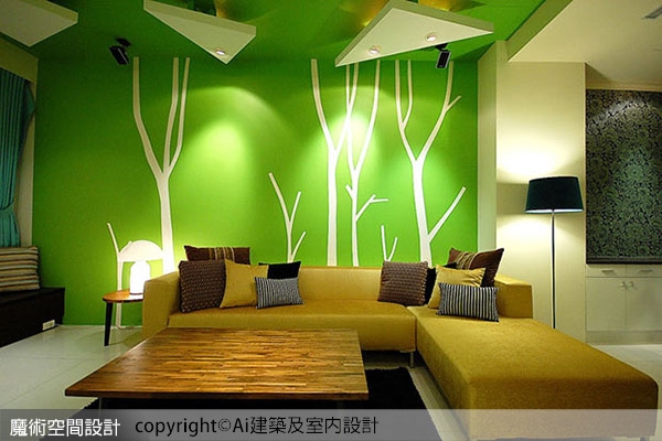 1.客廳沙發背牆採用綠色背景延伸至天花,創造綠色森林的意象,點綴線條優美的白色枝幹,描繪出自然生息。