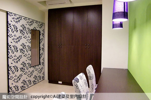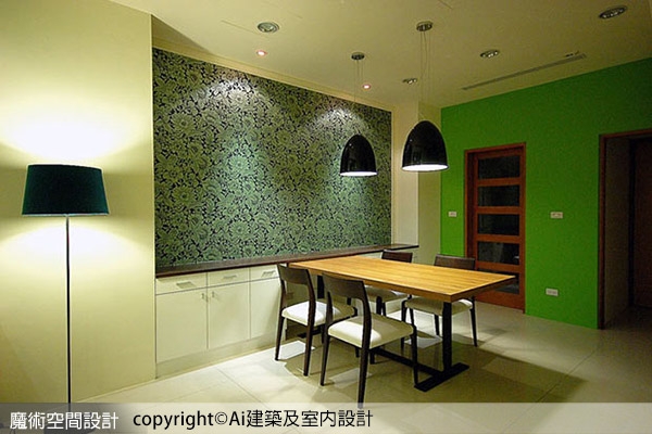 ▲餐廳以花色壁紙鋪陳主視覺,淡化機能收納櫃量體,另一側則以綠色呼應客廳設計語彙。
