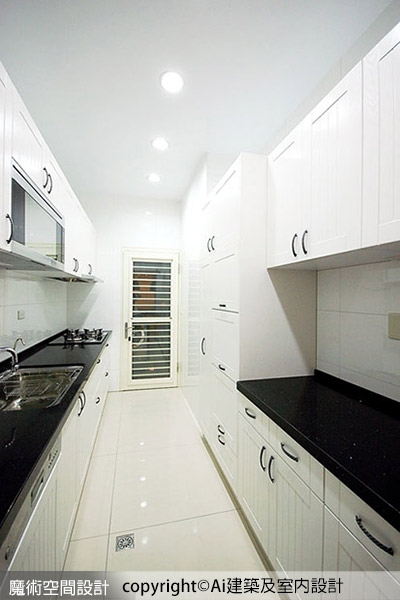 ▲廚房以黑白色調為主題,雙軌動線設置料理區與電器收納、置物檯面等,清爽整齊。