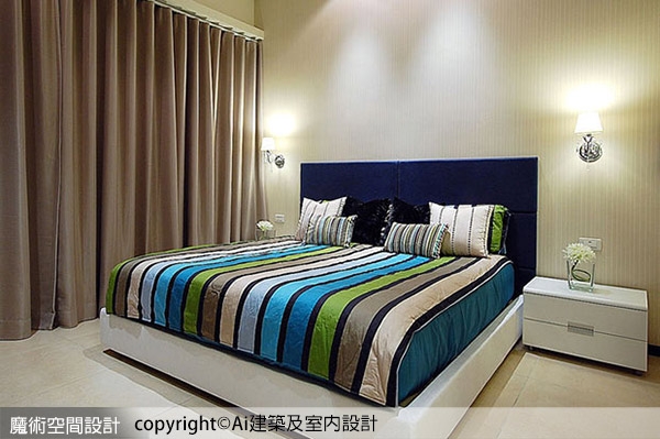 ▲主臥以柔和壁紙搭配對稱典雅壁燈,襯托藍白色臥寢家具的獨特質感。