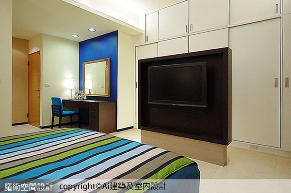 ▲周先勤總監以帶有結構感的美學表現機能設計,視廳設備兼動線引導隔屏,將收納歸屬於睡眠區之外。