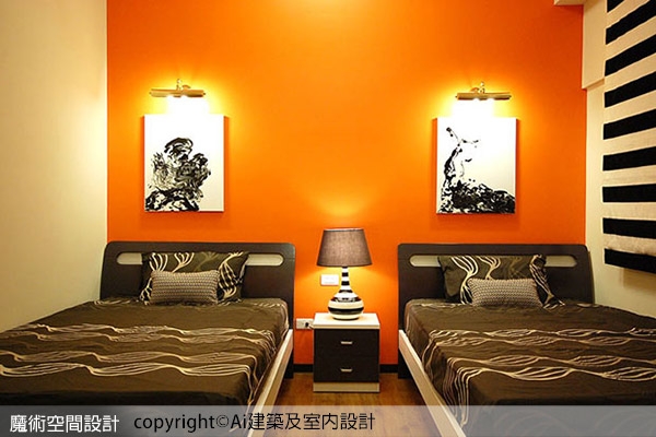 ▲小孩房床頭以充滿能量的鮮橘色為背景,藉由畫作、燈飾、床頭板聚焦對比色,凸顯視覺張力。