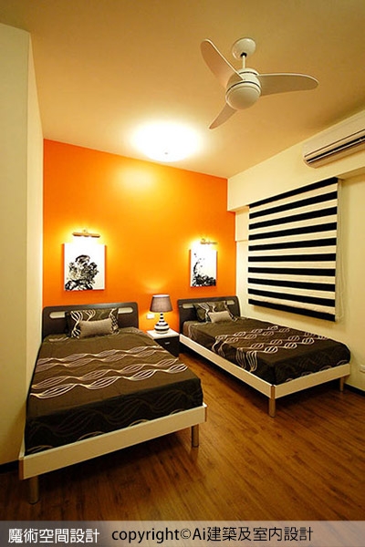5.私密空間除了完善機能外,分別以搶眼色彩作為表現主題,主臥以藍白配色為焦點,小孩房則以鮮橘色搭配黑白配,視覺張力十足。