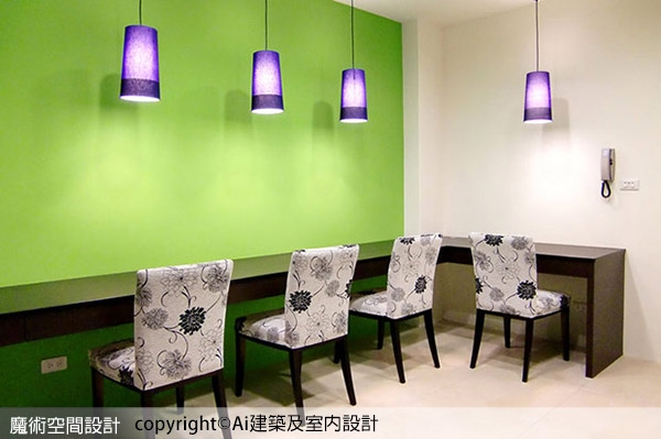 ▲書房順沿壁面規劃L型桌面,跳色處理增加活潑生氣,吊燈對應座椅區分位距。