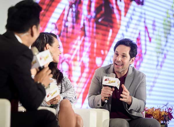 兩人接受主持人採訪時,大談拍攝《蟻人與黃蜂女》期間發生的趣事,兩人被問到是否喜歡自己在電影中的服裝時,「蟻人」保羅.路德先表示蟻人裝相當的貼身,但是當他看到星際異攻隊的德克斯(巴帝斯塔 飾)時,就覺得自己好像沒理由抱怨,畢竟自己下戲就可以換掉衣服,但是巴帝斯塔卻是要花一整天作特殊化妝。「黃蜂女」伊凡潔琳則說,自己的黃蜂女非常酷,還說「我不管做什麼都穿著它,從不脫下黃蜂裝」,簡是直黃蜂女的最佳化身。而保羅.路德被問到這次蟻人終於有了搭檔黃蜂女一起出任務,但是黃蜂女的服裝備除了多了翅膀更能發射生物電流,會不會覺得不平衡? 保羅笑答:「我覺得我能坐在螞蟻背上就已經夠酷了」。首次來到台灣的兩人,也同時希望接下來希望能跟台灣粉絲有更多交流互動的機會。
