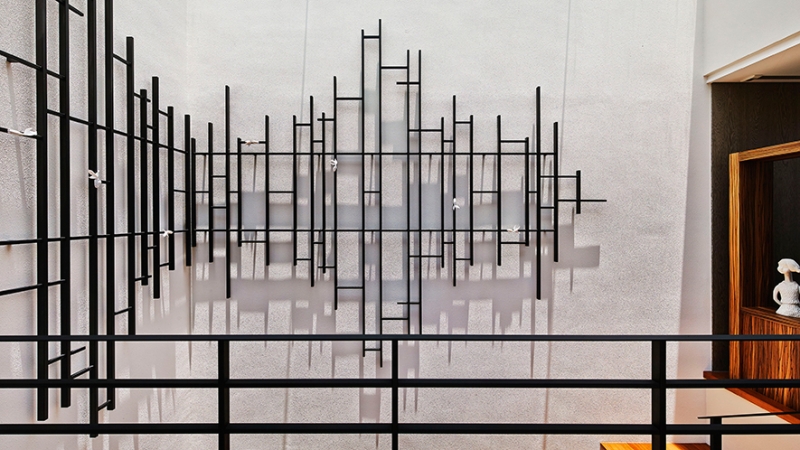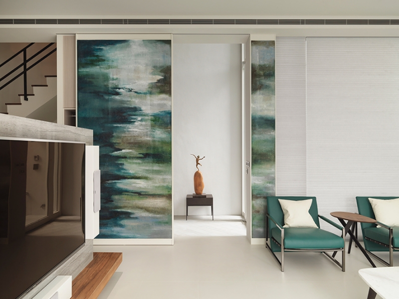 藝術元素從建築外觀延伸至室內空間,透過「天井」及「光線」的運用,打造鐵件裝置及自然光影的互動場域;牆上鐵件裝置以特殊結構工法,予之固定並承載其厚重質量,凸顯台灣工匠的絕佳技藝;並交錯點綴陶瓷金魚,使整體視覺充滿意趣,量身打造獨一無二的家中端景。