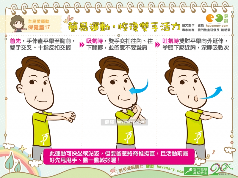 吐氣時,緩緩將雙肘平舉、拳頭下壓靠近胸口,手肘盡量向外延伸、停留,並做深呼吸調息,再盡量往上抬高後還原到預備姿勢。一樣再吸口氣、吐氣,往反方向倒轉回來;放鬆下來後記得休息片刻,在血液能慢慢流到指尖末梢。亦可再換手(右手在上、左手在下)交扣練習,伸展肌肉、活動筋骨,以促進血液循環。