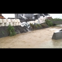 連日下雨暴漲,枋寮北勢溪旁這一大包一大包的太空包,被沖落,這是專門處理「工程土石資源的」土資場堆置的,太空包裡面的東西,也沖入溪水,顏色還有點轉綠,民眾說非常詭異的顏色,居民擔心是工業污泥或其他汙染物。