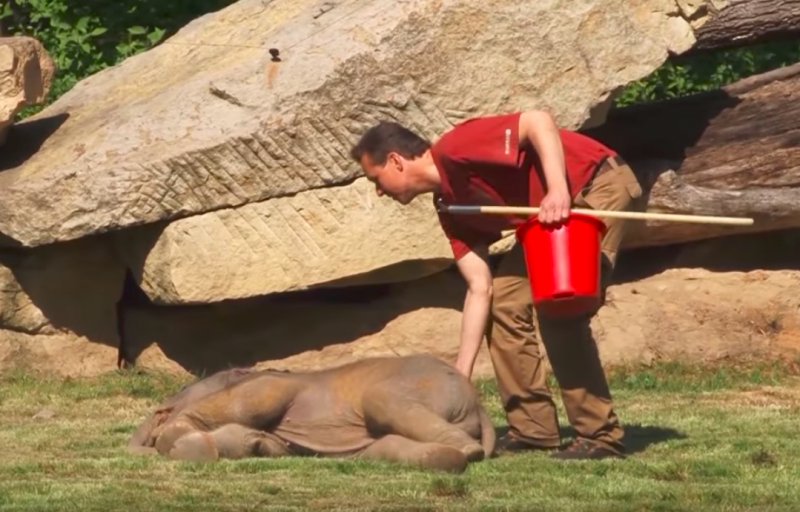看到焦急的象媽媽和倒在一旁的小象,趕緊請了保育員進來看看發生什麼事