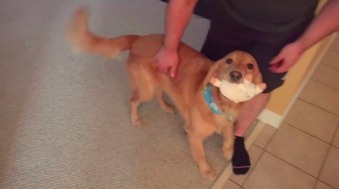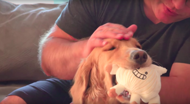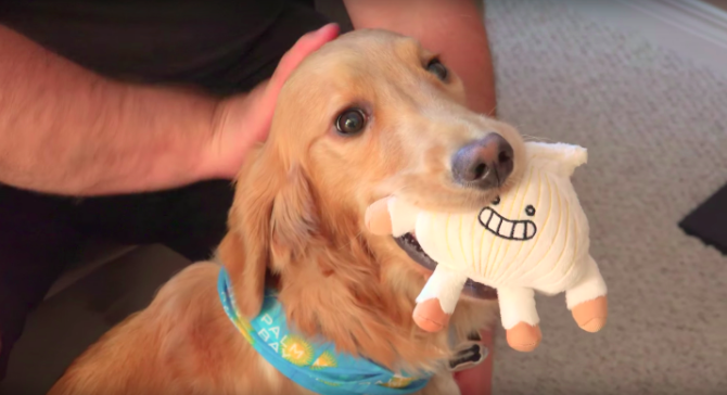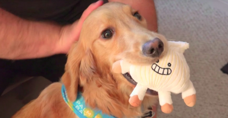 據YouTube帳號AprilsAnimals分享的影片,一隻名叫黃金獵犬-Cinnamon,就有特別鍾愛的填充娃娃,這個外型像大蒜的娃娃,Cinnamon不管走到哪都要帶著它,但是這個大蒜娃娃竟然被其他汪夥伴咬壞了!自從大蒜娃娃壞掉後Cinnamon就變得很沒精神,感覺非常地難過,重點是,這個娃娃是參加excel口香糖公司辦的活動得到的,在市面上完全找不到,最後主人只好到他們的粉絲專頁留言求助,結果excel口香糖的回應讓他們超感動!