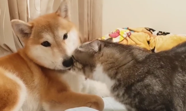 貓主子沖向柴柴,快把麻麻的心臟給嚇出來了。沒想到下一秒竟然不是要打架的而是要撒嬌?!這一狗一貓玩起來也太可愛了吧!感情真好!