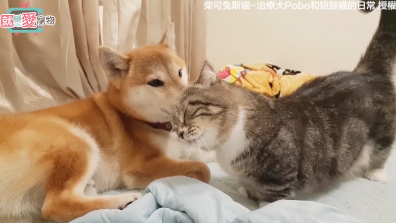 ▲這樣恩愛真的好嗎?(source:影片截圖/柴可兔斯貓-治療犬Pobe和短腿貓的日常)