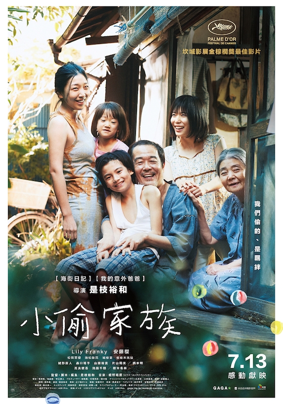 這部榮獲坎城影展最佳影片「金棕櫚獎」肯定,並蟬聯日本雙週票房冠軍的《小偷家族》,劇情描述在東京下町林立的高樓大廈之間,不合時宜地殘存一個破舊平房,裡面住著年邁的母親初枝(樹木希林飾演)、治(Lily Franky飾演)與信代(安藤櫻飾演)夫婦,以及他們的兒子祥太(城檜吏飾演),還有信代的妹妹亞紀(松岡茉優飾演)。這家人仰賴初枝的老人年金過活,當年金不夠用時,就會靠在外頭順手牽羊來補貼家用。雖然他們處在社會底層,但每天依然快樂地過生活。某個冬天,治帶回一位在附近公寓被凍僵的少女百合(佐佐木美優飾演),加入他們原本就貧困潦倒的家庭。以此事件為契機,這個原本融洽的家庭,逐漸四分五裂,彼此心中隱藏的秘密與願望也逐漸明朗…