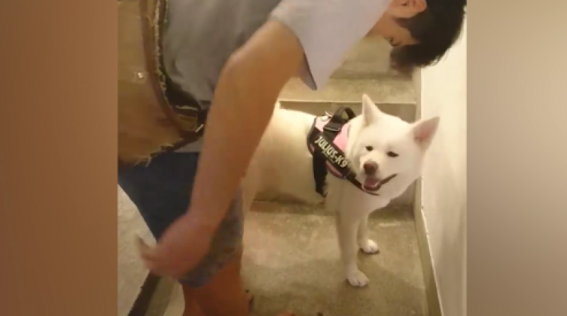 ▲拔拔背著馬妃上樓梯(source:影片截圖/柴犬兄馬柴達x秋田犬妹馬妃)
