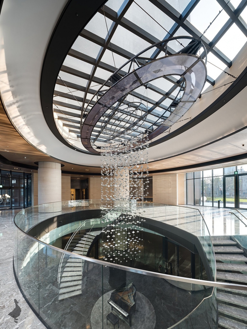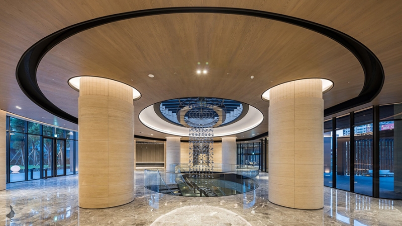 進入公設內部,挑高的大廳盡現尊榮與大器,特殊設計的造型穹頂,利用同心圓內部嵌入六個橢圓,高低差距營造不斷延伸的視覺效果,以清新透亮的姿態將光挹注於整個內部角落,矗立四方的洞石圓柱連接上方橢圓天井與米白壁面,延伸整體空間的連續性,在縱與橫之間劃出不同的機能動線,成為融合與轉換的中心點。
