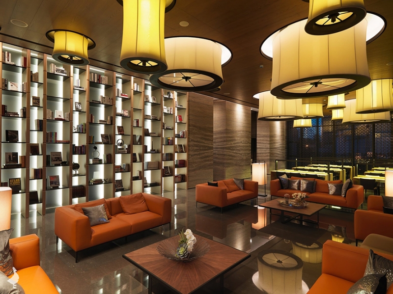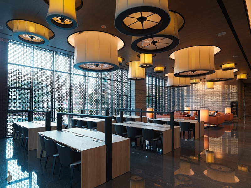 圖書室入口意象造景,以文字記錄方式為發想,以竹簡進而轉變為古書,而至現代彩色印刷的書籍;從古到今、由暗轉明成為知識傳承的起點。延續洞石細膩雅緻的觸感,鋪墊出溫和放鬆的氣息,空間被妥善的分成兩端,悠閒愜意的沙發區與仿造自習室的閱讀桌,提供多面向的選擇。五米高的書牆、五百本藏書,使空間流露濃厚的人文氣息;利用雷射切割的大片窗花,局部遮擋日照西曬的刺眼光芒亦能使窗外美景隱約地映入,在遮掩與穿透之間取得完美平衡;以蠟燭為發想的柱燈,大小錯落不但解決了消防難題,也為天花板添上不少活潑氣息,讓書客不自主地莞爾一笑。