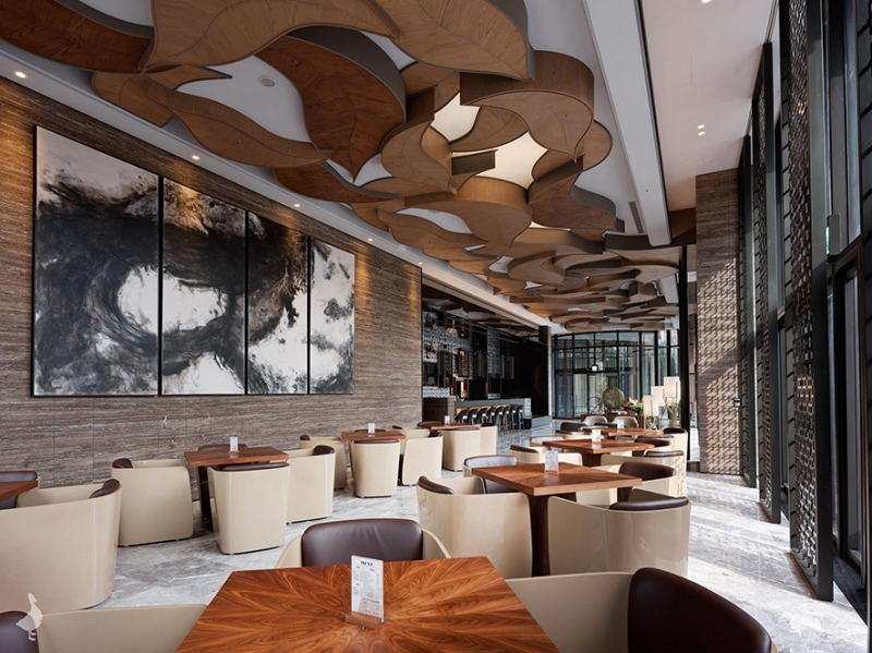 位於東面的咖啡廳提供住戶悠閒的用餐時光,前後端的不同設計,應對一天中不同機能的使用:早晨作為早餐廳;下午時喝杯咖啡;也可以是晚上雅痞聚會的LOUNGE BAR。以黑色鍍鈦圍塑出的吧檯空間,金屬磚的壁面處理搭配著玫瑰金色調的紅酒架,展示現代優雅質感;以仿生概念轉化葉型天花板,一片片錯落的樹葉透映灑落的陽光,延續鄰近南坎溪邊的美景,沐浴於靜謐森林的懷抱中。
