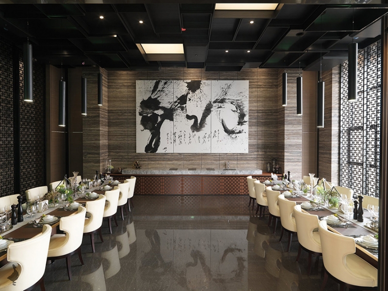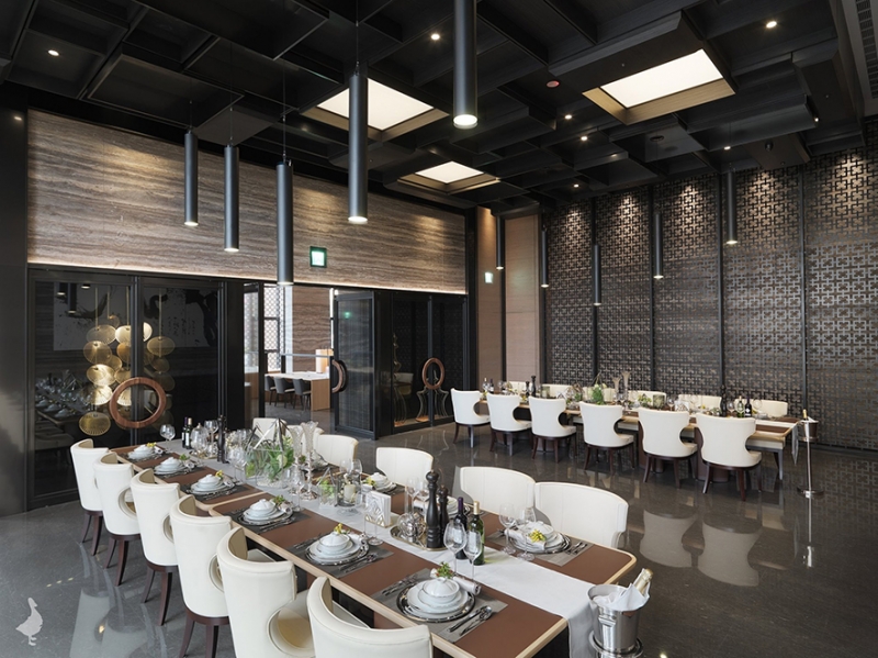 在圖書室與咖啡廳之間的多功能室配備廚具設備,可以是宴客聚餐的場地,也可以是廚藝教室,怎麼使用只存乎一心。天花板處利用了方形量體的高低錯位,提供了不同功能的照明需求,而吊燈則採用智慧式控制,連接手機就能自由指揮燈滅燈亮及排列高低;主牆面懸掛新銳藝術家的得意畫作,大器奔放的潑墨作品,提升環境的藝文習性;兩側則延續了窗花穿透的感受;端景的展示櫃,不但放大空間的視覺效果,內部藝術造景也提升宴會廳的質感。