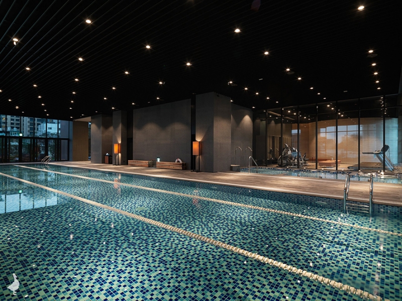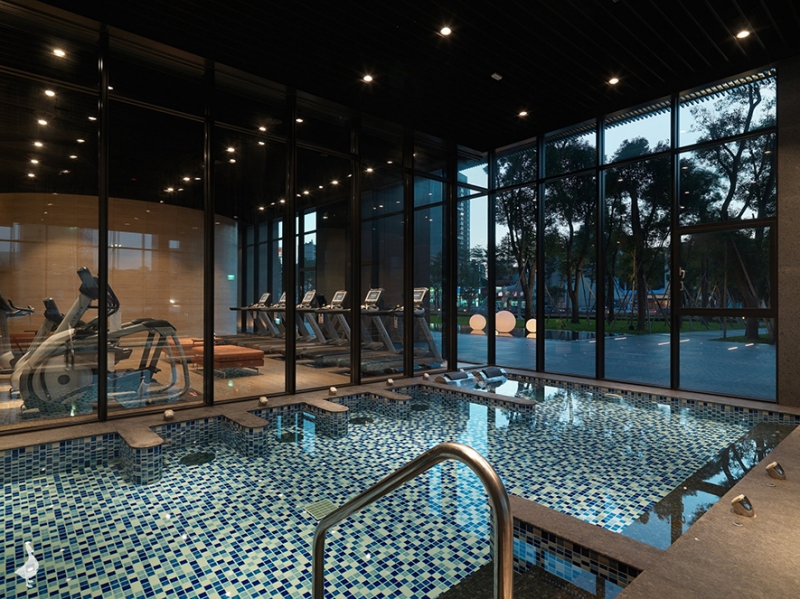 在台灣高度密集的居住環境下,規律的運動成為了一種奢侈。一整天的工作疲憊,在返家轉換心情後又有獨立且廣大的運動空間,不諦是現代人的一種享受。大面積的落地窗迎向室外絕美風景,白天的茵茵綠地與晚上的高樓夜光盡收眼底,通過廣大的視野營造出美好的休閒時光;天然的藍銀灰石及金屬隔柵天花,健身房的木質地板及灰鏡呈現出空間俐落感,簡約、極致的鋪呈出運動的本質。